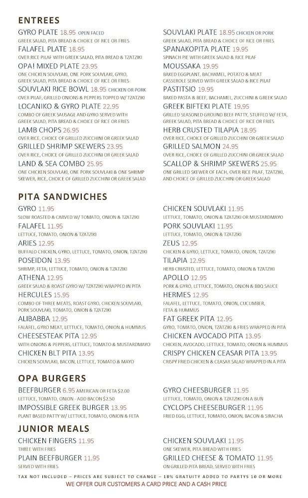 Opa! Gyros boasts a vast menu featuring Mediterranean staples. Key highlights include gyros, falafel plates, and fresh salads like Horiatiki. Each dish incorporates authentic ingredients, from house-made tzatziki to fragrant spices. Appetizers like saganaki and calamari start the meal off delightfully. For those who love variety, the Opa! mixed plate combines several popular items on one platter. An enticing selection of desserts, including Nutella crepes and rich baklava, rounds out the menu beautifully. Vegetarian options abound, assuring everyone can enjoy a meal here.